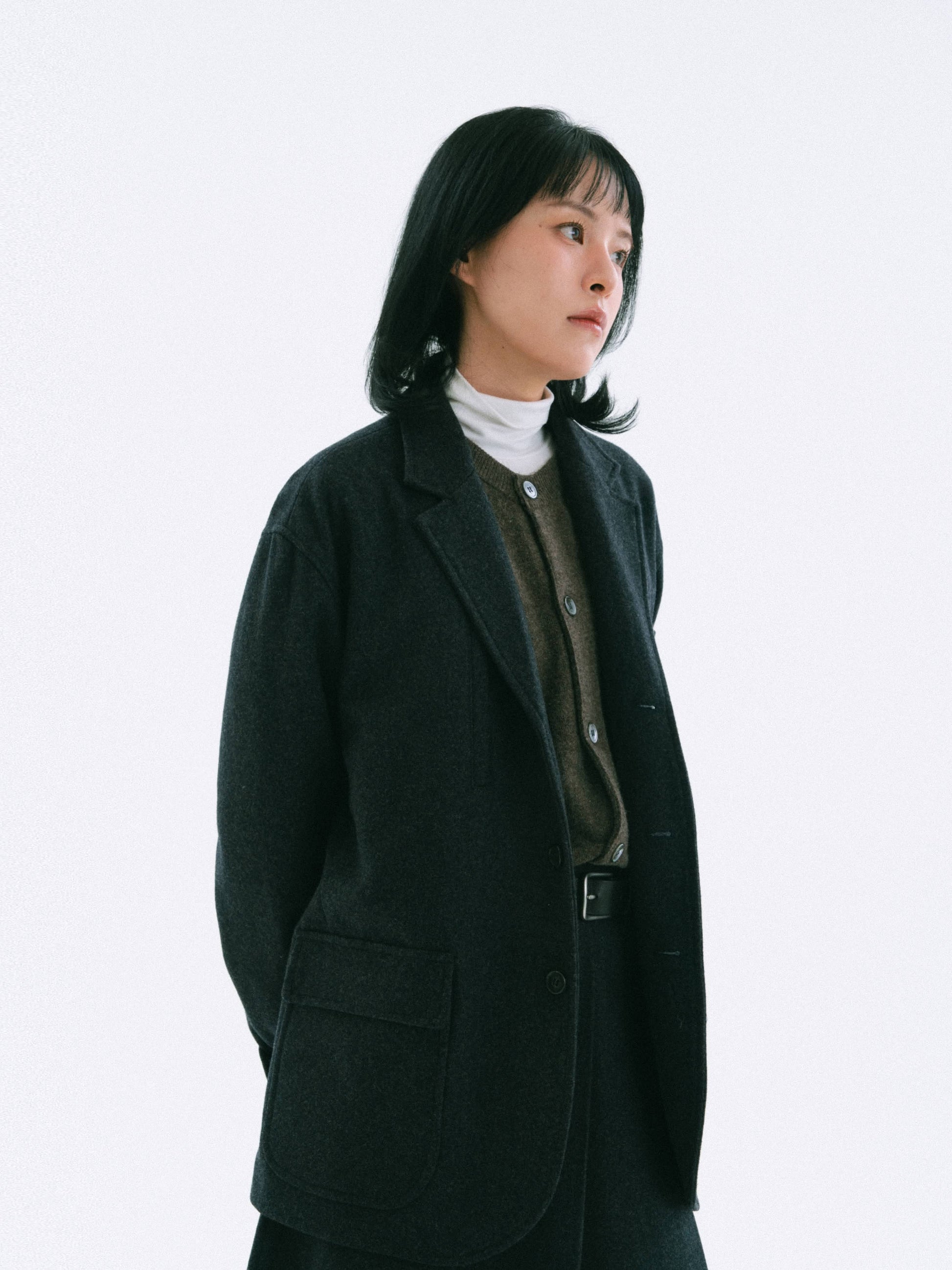Made from a wool and polyester blend, it features a soft touch and high durability. It resists pilling and maintains its stable silhouette over time.
