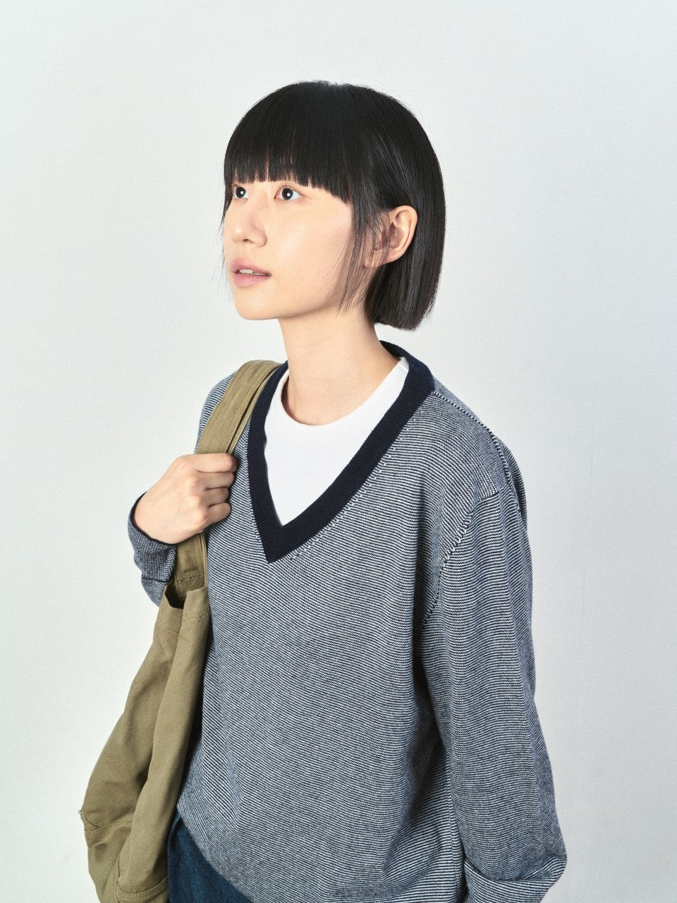 (W)Pin-Stripe V-neck Knit - Olive | W0 (S)